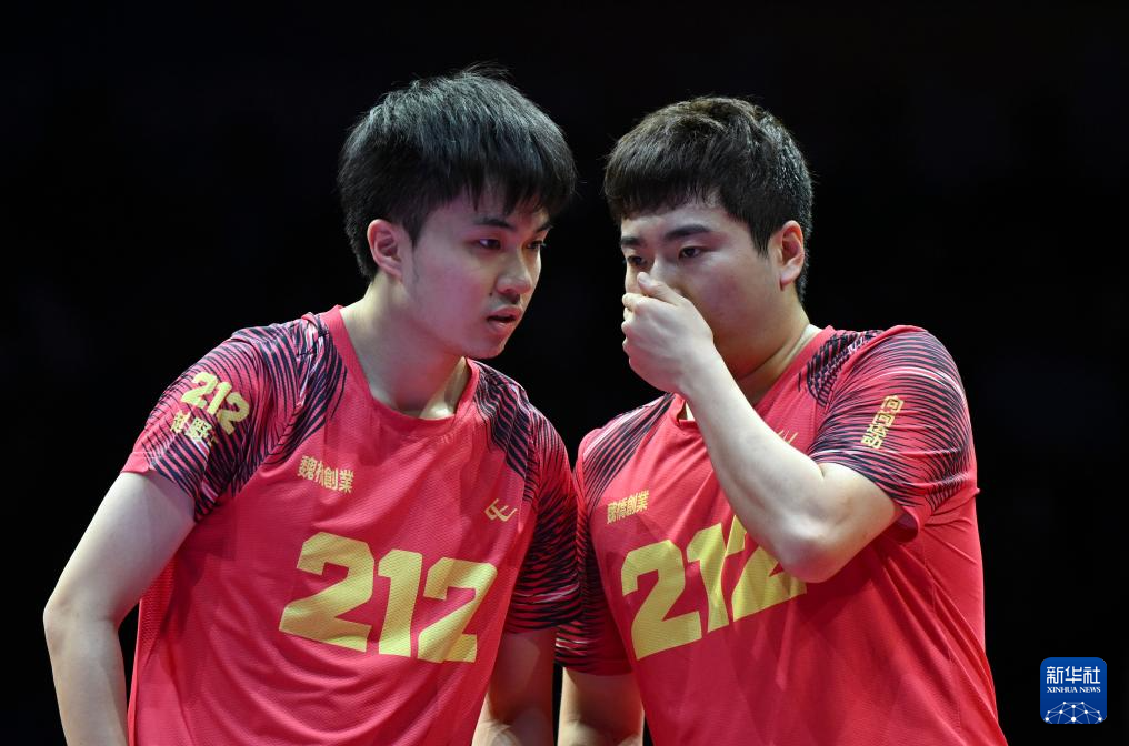 1月1日,山东魏桥·向尚运动队组合林昀儒/梁靖崑(右)在双打比赛中商讨战术。他们3比2战胜黄石基地·华新队组合向鹏/薛飞。