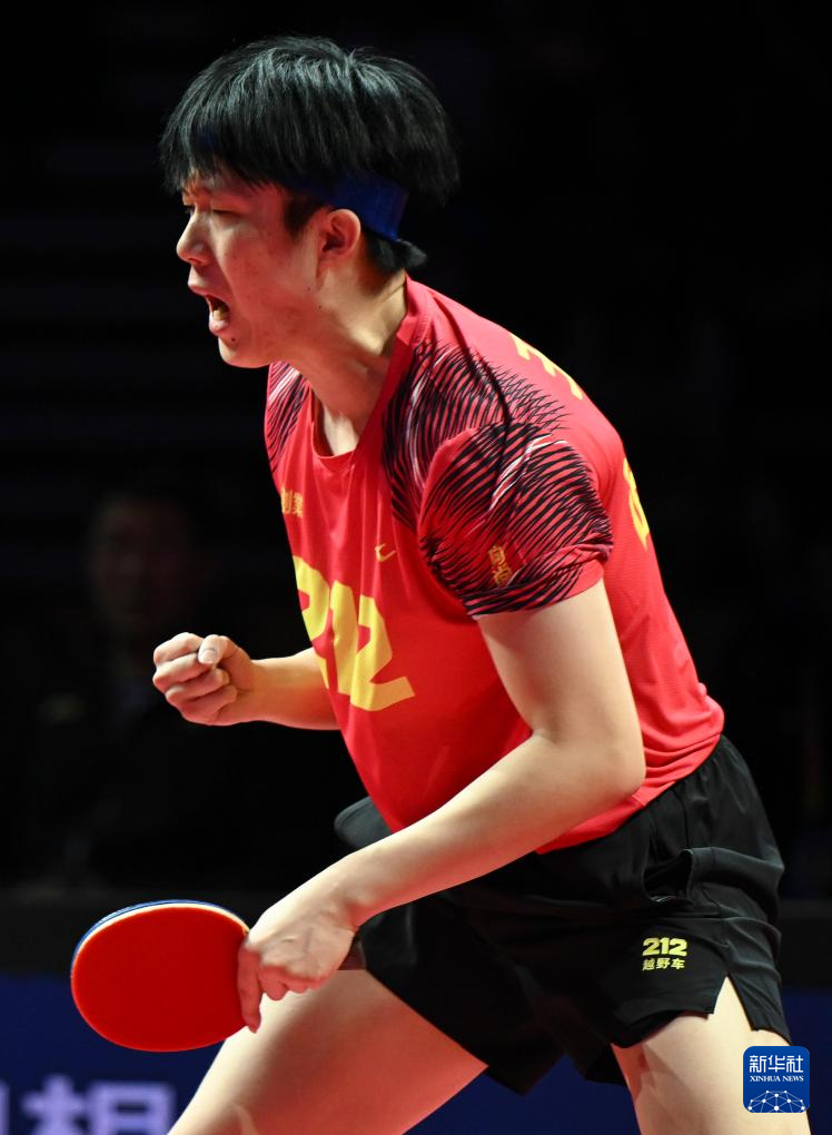 1月1日,山东魏桥·向尚运动队选手王楚钦在单打比赛中庆祝得分。他3比2战胜黄石基地·华新队选手林诗栋。