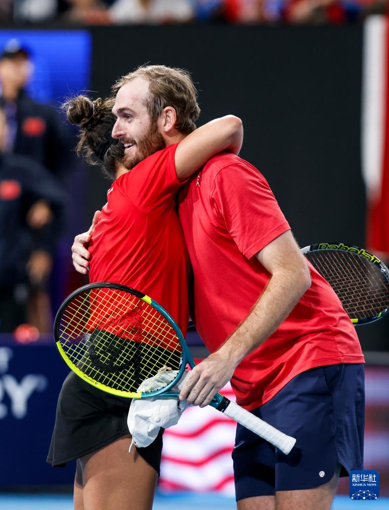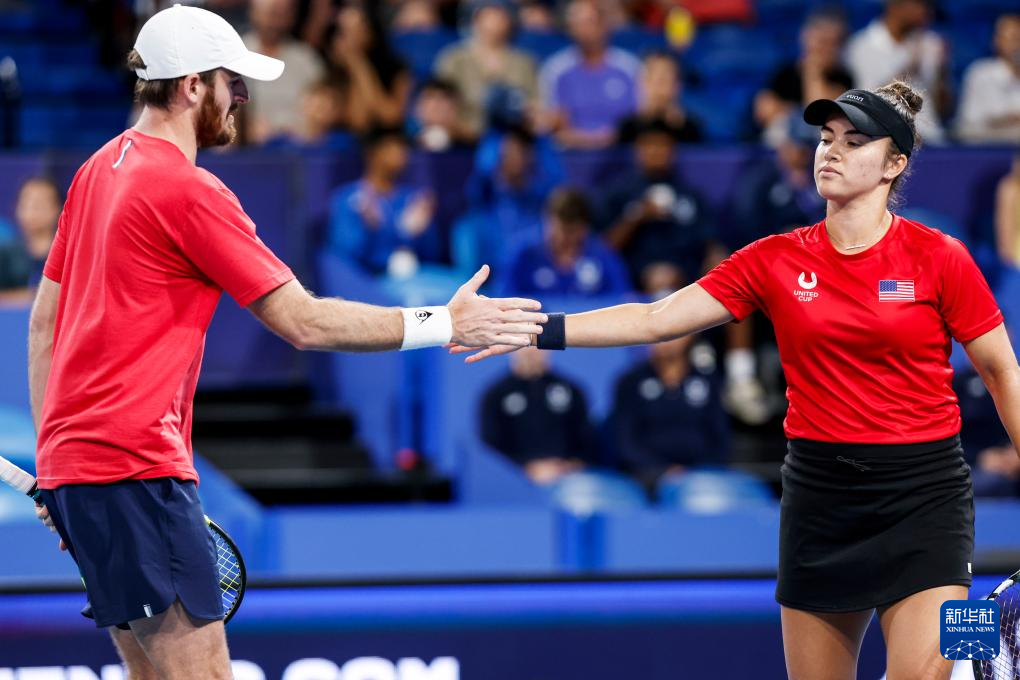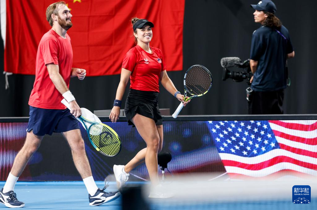 1月1日,美国队组合克拉夫奇克(右)/加洛韦在混双比赛后庆祝胜利。最终,他们2比1战胜中国队组合张帅/孙发京。
