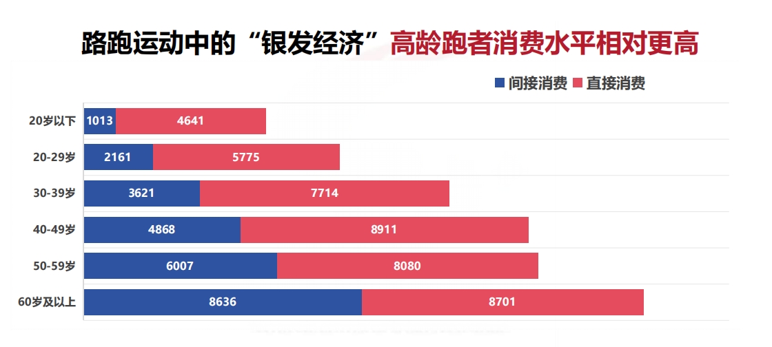 值得一提的是,报告数据显示,路跑消费领域“她经济”和“银发经济”显著,女性跑者总体消费水平高于男性跑者。路跑运动中,女性跑者人均间接消费为4261.11元,人均直接消费达8959.15元,展现出女性在路跑运动中的积极投入和较高消费意愿。同时,高龄跑者消费水平也相对较高。随着年龄增长,跑者的消费需求和能力并未减弱。在各年龄段中,60岁及以上跑者在间接消费和直接消费上均处于较高水平,人均间接消费为8636元,人均直接消费可达8701元。高龄跑者已成为路跑消费市场中的一股强劲力量。