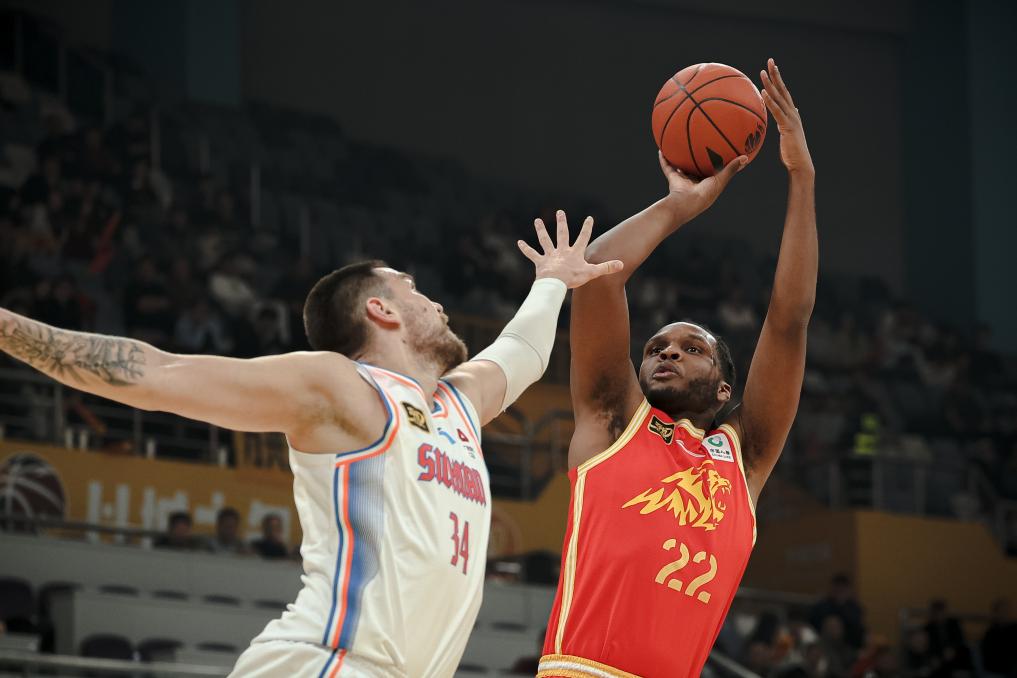 2024年12月26日,广厦队球员卡尔顿(右)在比赛中投篮。新华社记者 江汉 摄