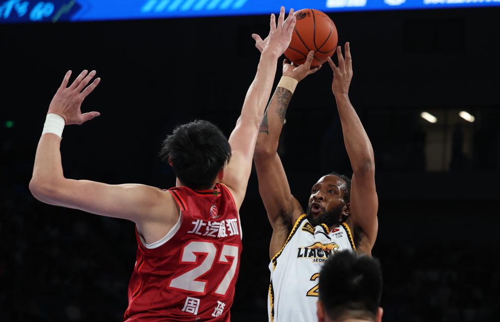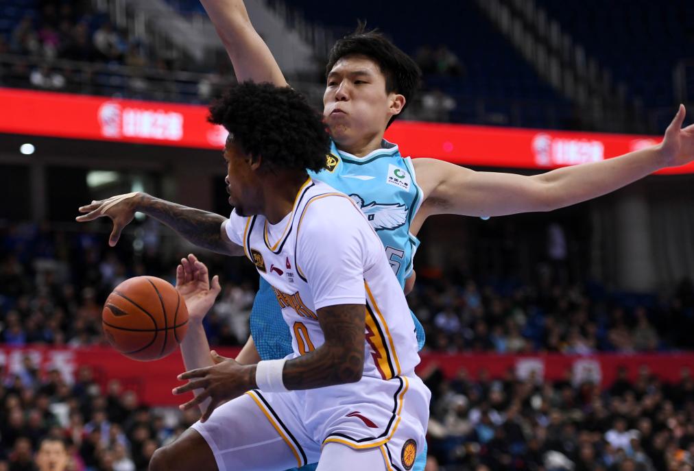 1月1日,辽宁队球员威尔斯(右)在北京队球员周琦的防守下投篮。新华社记者 王楷焱 摄