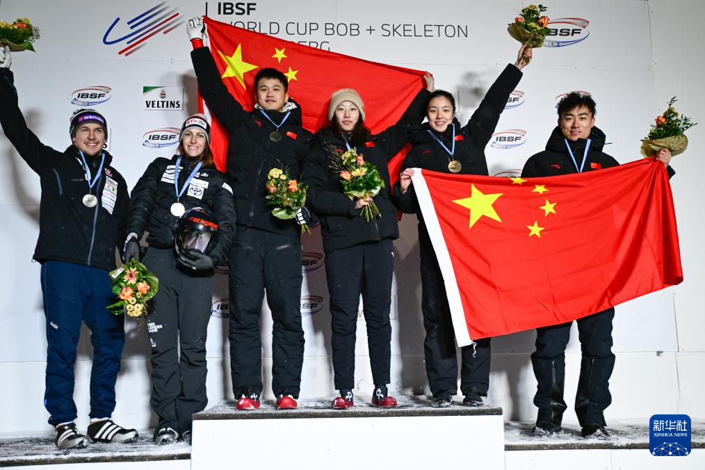 当日,在德国温特贝格进行的2024-2025赛季国际雪车联合会钢架雪车世界杯混合团体决赛中,中国组合赵丹/林勤炜以2分00秒87的成绩夺得冠军,黎禹汐/殷正以2分01秒28的成绩获得季军。