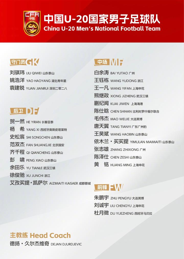 主教练久尔杰维奇此次征召了全部适龄主力球员,王钰栋、依木兰·买买提、朱鹏宇、毛伟杰、蒯纪闻、刘诚宇等悉数在列。此外,本期名单中还有杜月徵、杨希、陈仕晗3名在海外效力的球员。