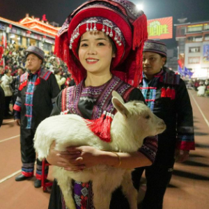 2023年6月30日,村民在贵州“村超”足球赛场旁的文创摊位展示民族服饰。新华社记者 杨文斌 摄