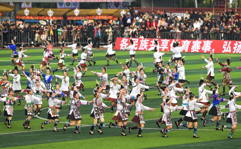 1月4日,榕江三中的学生在揭幕战半场时间表演舞蹈《侗家姑娘》。新华社记者 杨文斌 摄