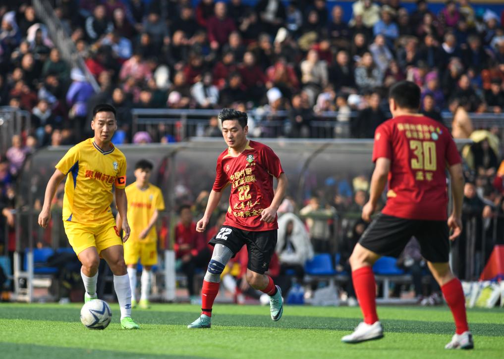 1月4日,贵州“村超”联队(黄色球服)与湘西茶超队在“村超”球场举行友谊赛。新华社记者 杨文斌 摄