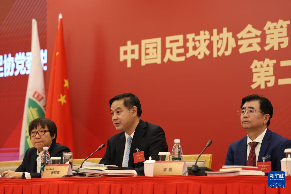 1月9日,国家体育总局副局长、中国足球协会党委书记张家胜(中)在大会上发言。新华社记者 胡星宇 摄