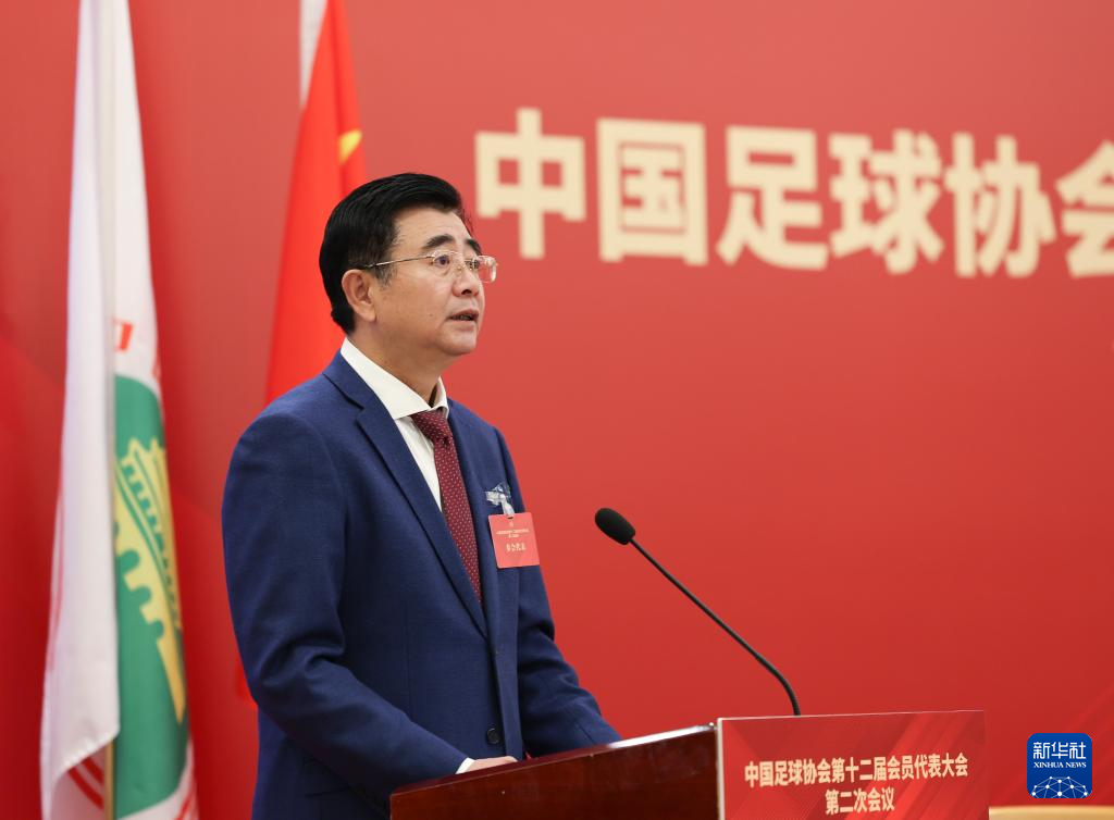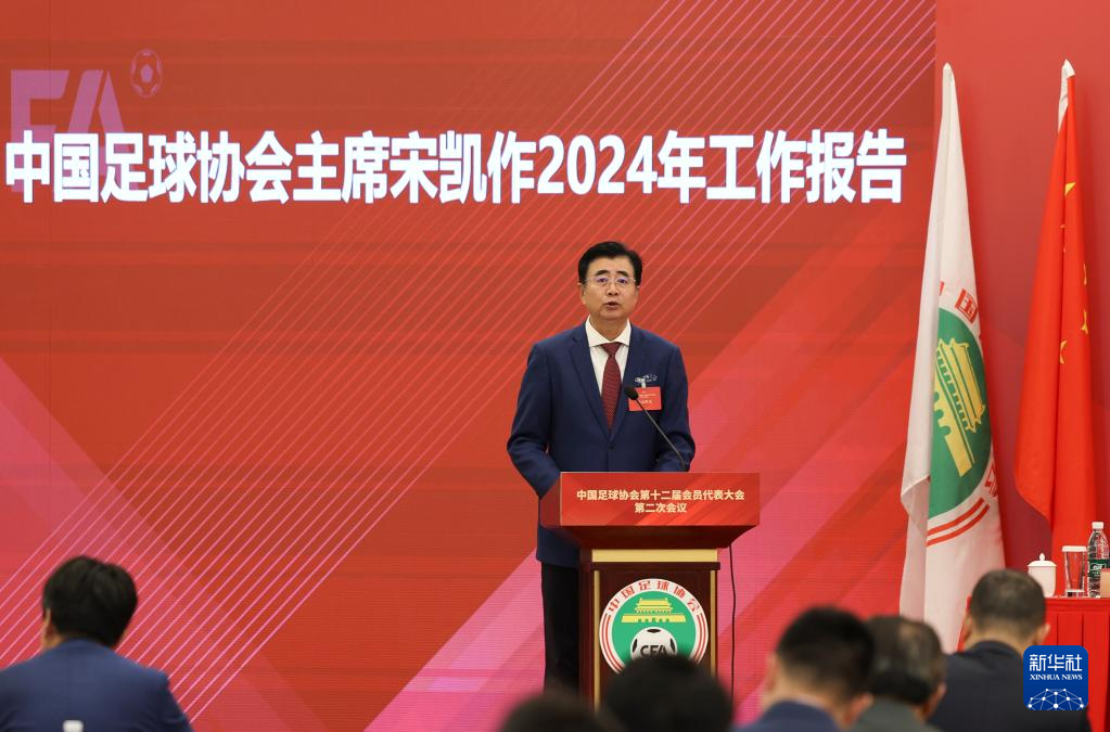 1月9日,中国足球协会主席宋凯在大会上作2024年中国足协工作报告。新华社记者 胡星宇 摄