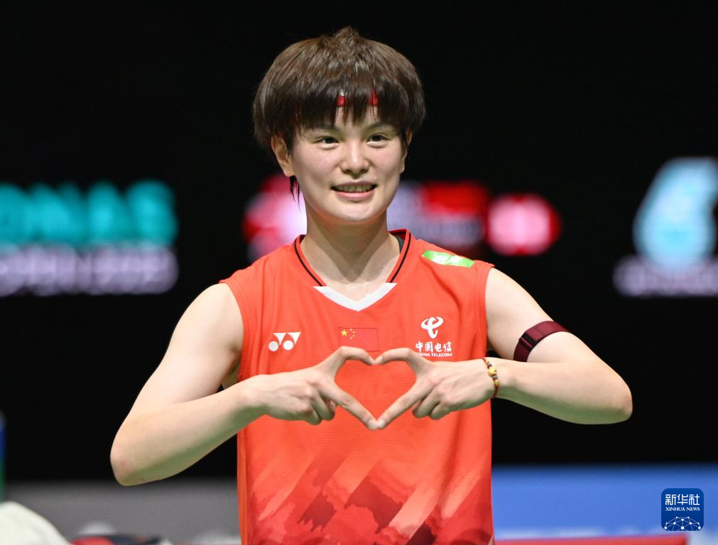 1月10日,王祉怡在赛后比心庆祝。新华社发(张纹综摄)