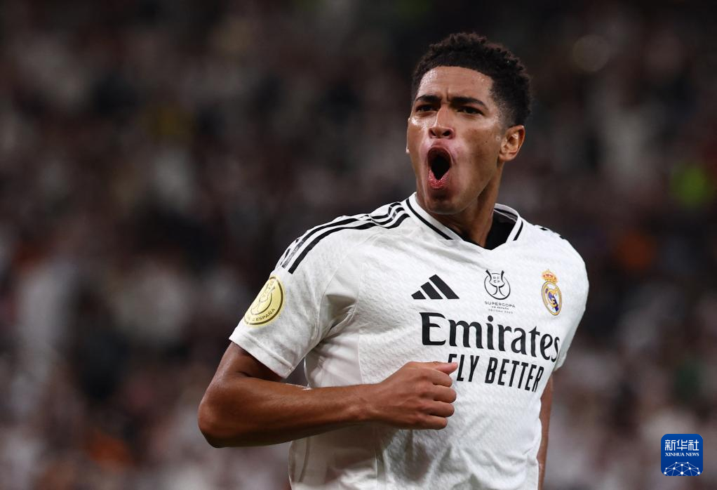 1月9日,皇家马德里队球员贝林厄姆在比赛中庆祝打入球队第一粒进球。新华社/路透