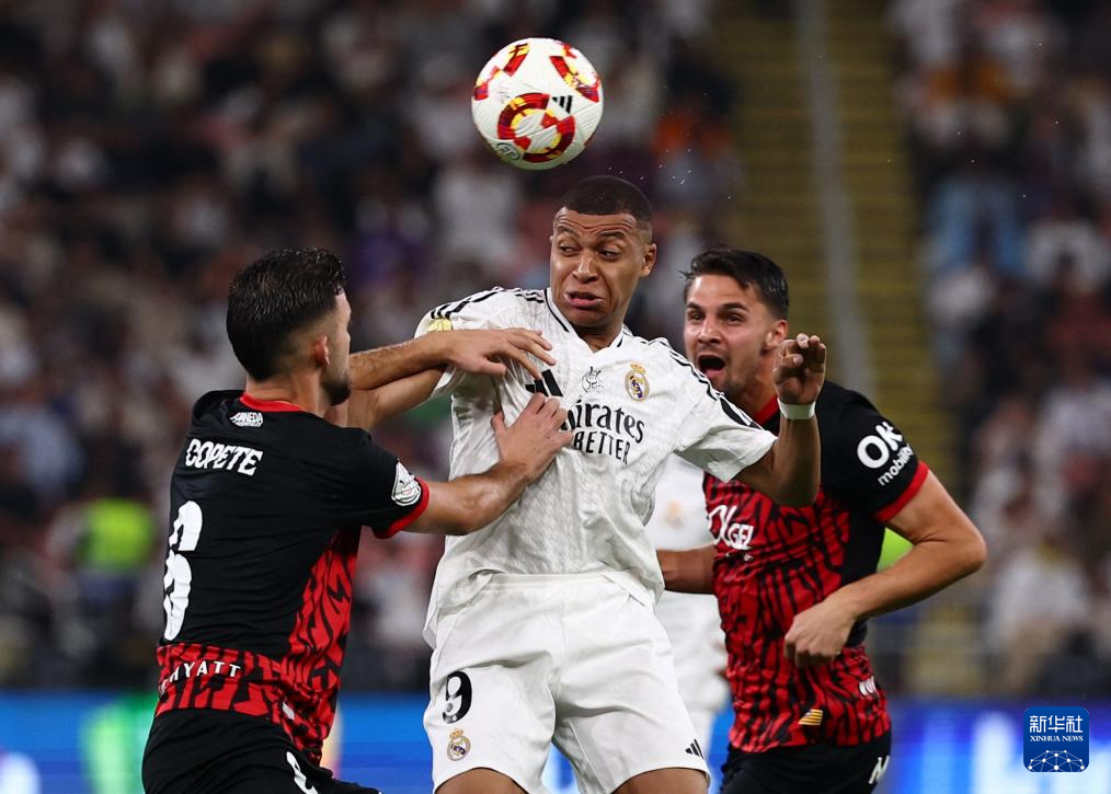 1月9日,皇家马德里队球员姆巴佩(中)在比赛中争抢头球。新华社/路透