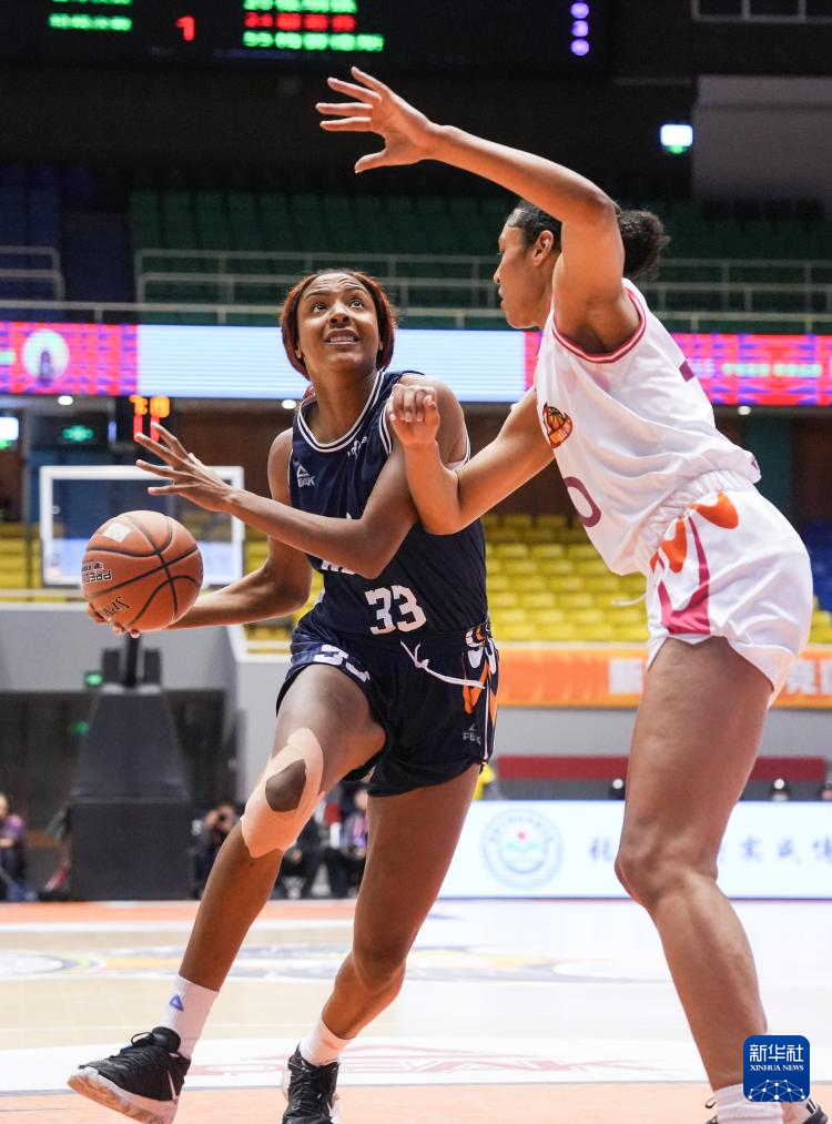 1月10日,石家庄英励队球员崔妮蒂·艾森斯·巴蒂斯特(右)在比赛中投篮。