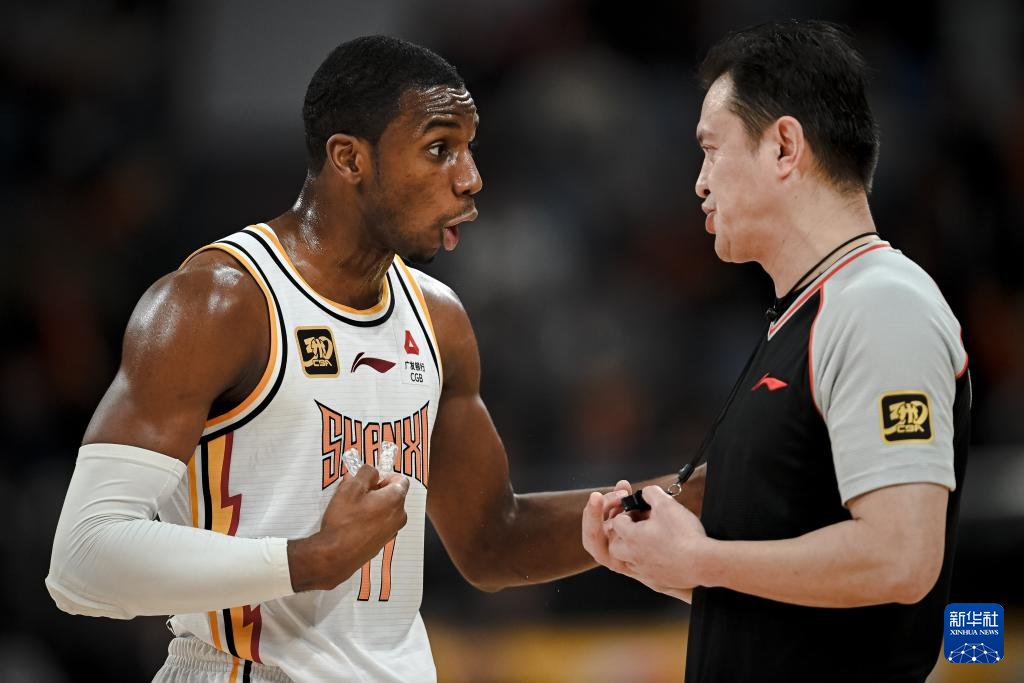 1月10日,山西汾酒队球员迪亚洛(左)在比赛中被判罚技术犯规后与主裁判段铸交流。