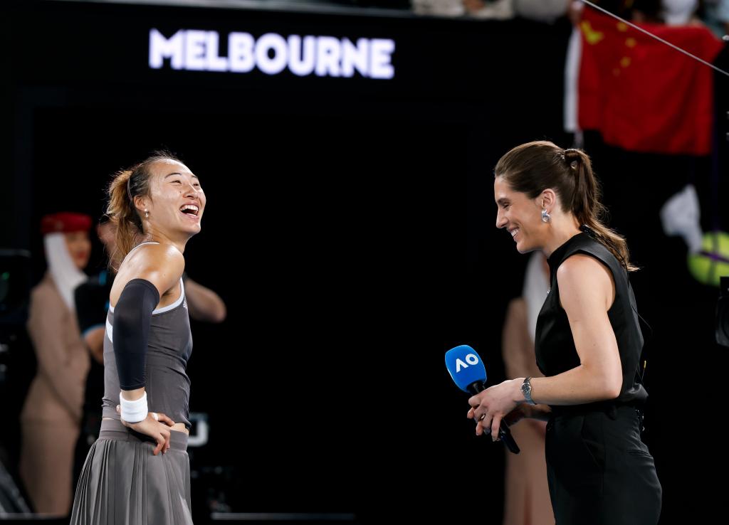 1月12日,郑钦文(左)在比赛后接受采访。新华社记者 马平 摄