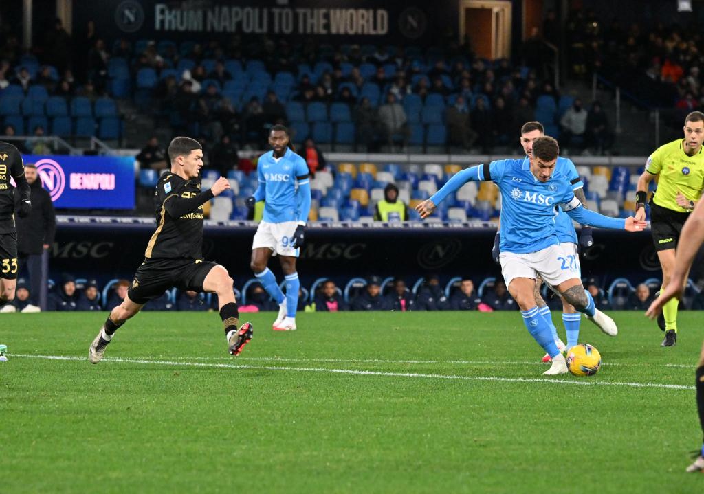 1月12日,那不勒斯队球员迪洛伦佐(右前)在比赛中射门,造成对方乌龙球。新华社发(阿尔贝托·林格利亚摄)