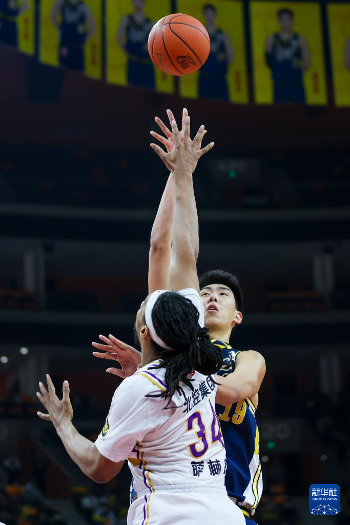 1月12日,北京控股队球员萨林杰(右)在比赛中上篮。