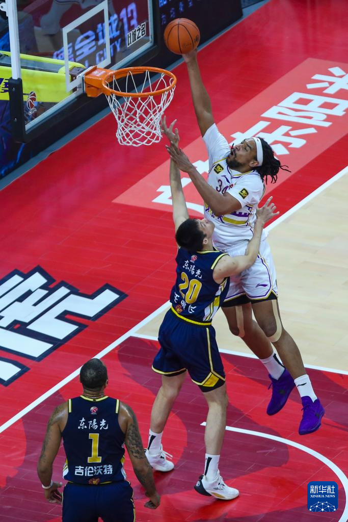 1月12日,广东东阳光队球员吉伦沃特(右)在比赛中扣篮。