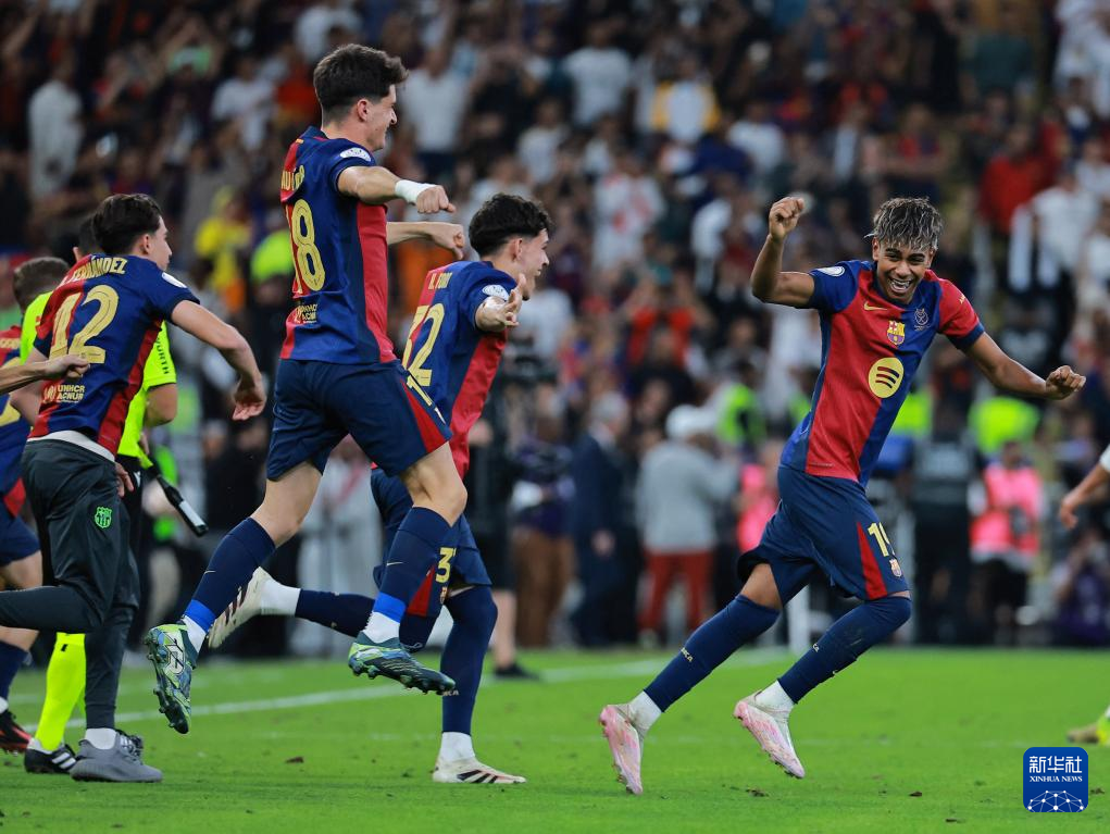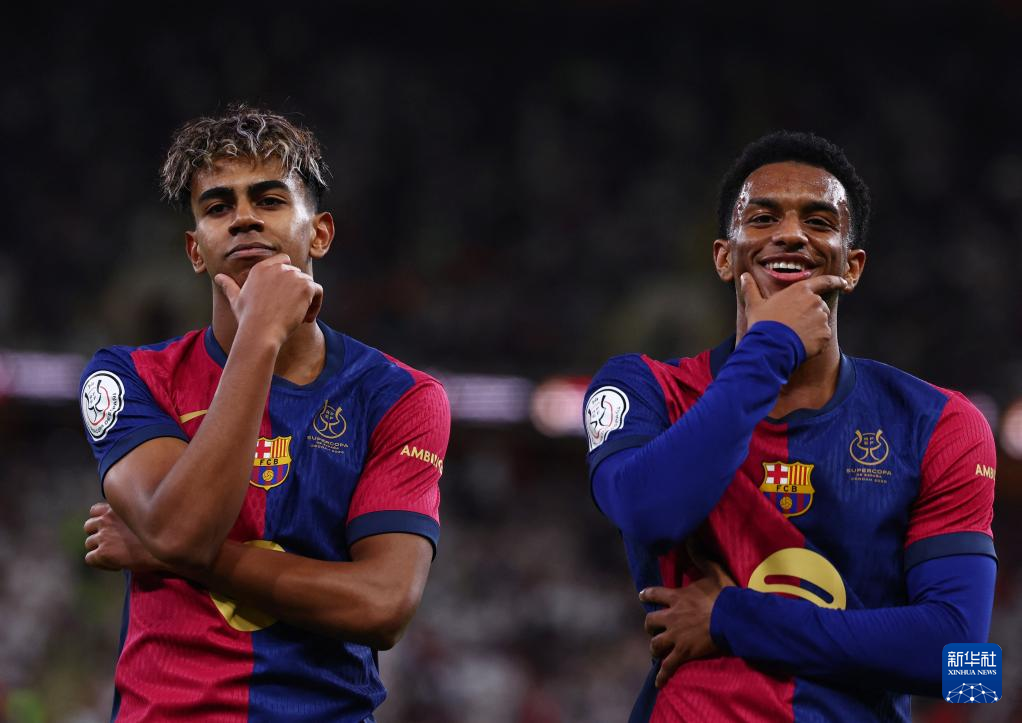 1月12日,巴塞罗那队球员亚马尔(右一)与队友庆祝夺冠。