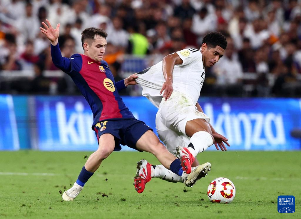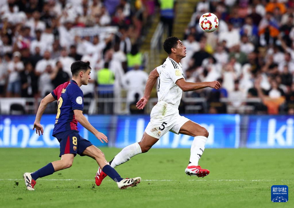 1月12日,皇家马德里队球员贝林厄姆(右)与巴塞罗那队球员佩德里在比赛中拼抢。