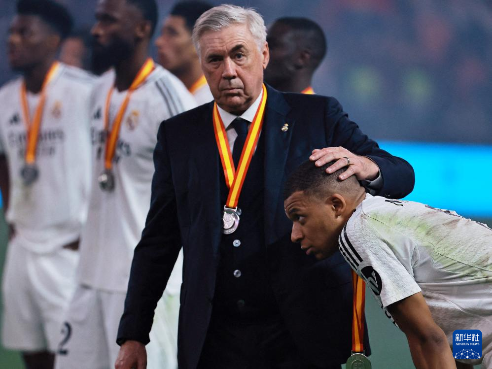 1月12日,皇家马德里队主教练安切洛蒂(左)赛后安慰球员姆巴佩。