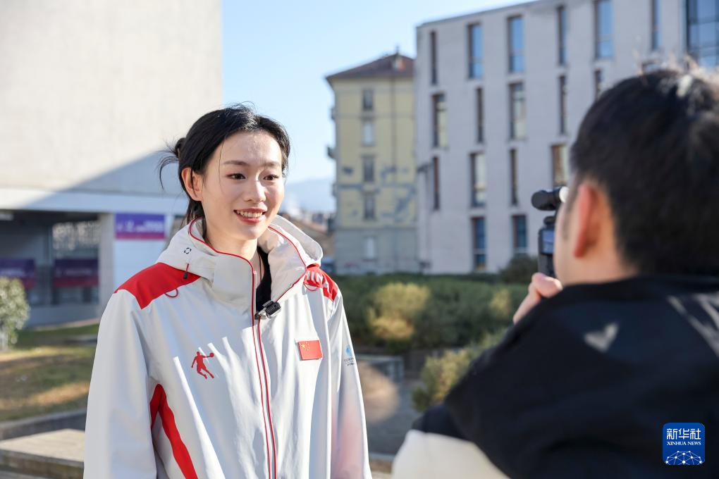 1月13日,中国代表团开幕式旗手、来自北京体育大学的女子冰壶队运动员裴君杭接受采访。
