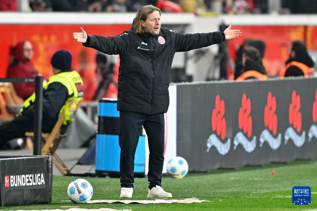 1月14日,美因茨队主教练亨里克森在场边指挥。