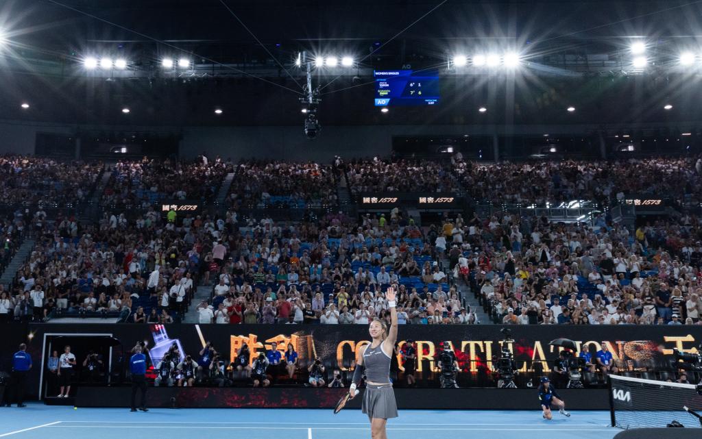 1月12日,郑钦文在比赛后向观众致意。当日,在墨尔本进行的2025年澳大利亚网球公开赛女单首轮比赛中,中国选手郑钦文2比0战胜罗马尼亚选手托多尼,晋级下一轮。新华社发(胡泾辰摄)