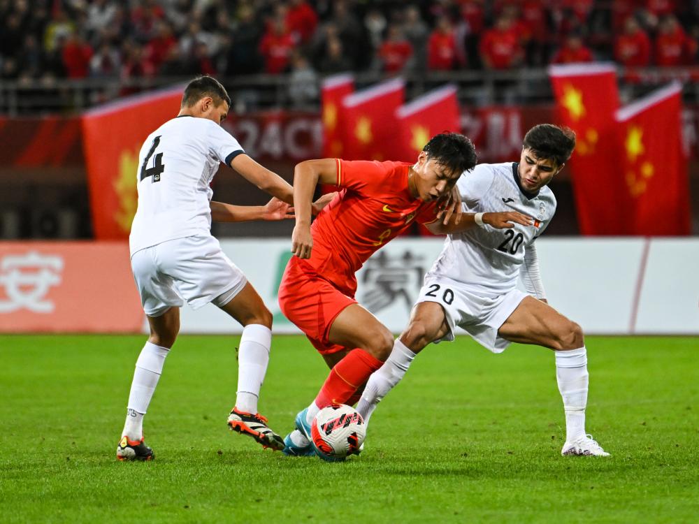 2024年11月19日,在四川成都举行的2024CFA中国之队·熊猫杯国际足球锦标赛中,中国队球员杜月徵(中)在比赛中进攻。新华社记者 王曦 摄