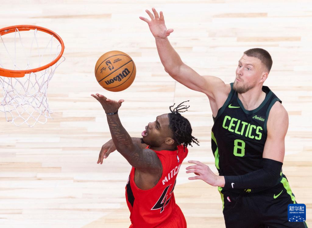 1月15日,猛龙队球员珀尔特尔(右)与凯尔特人队球员科内特在比赛中争抢篮板球。
