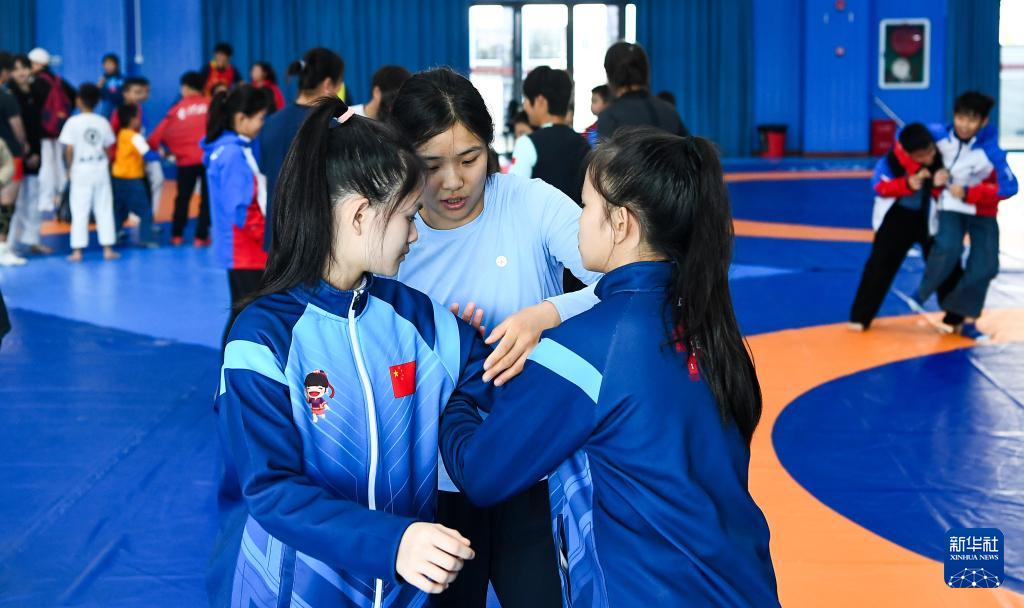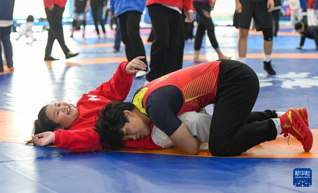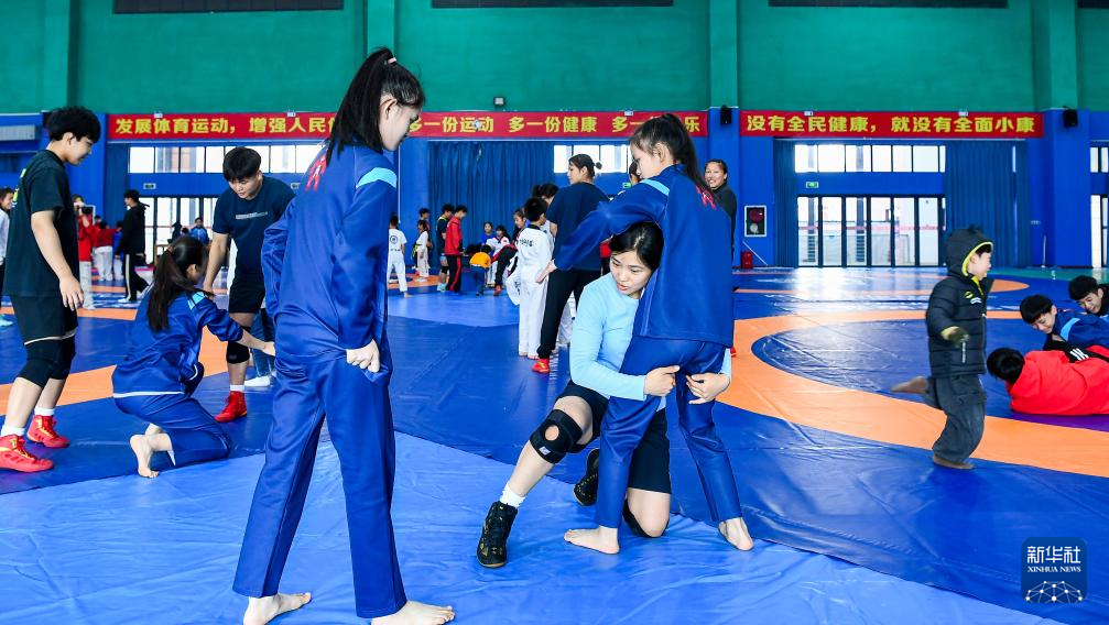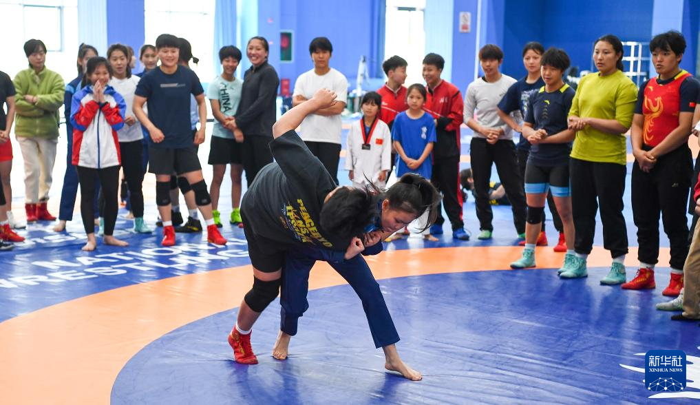 1月17日,国家摔跤队队员为小朋友讲解摔跤技术。