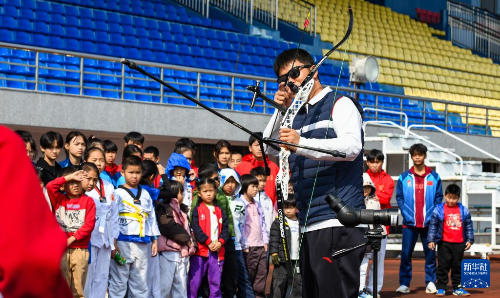 1月17日,国家射箭队教练邸云光为小朋友介绍射箭器材。