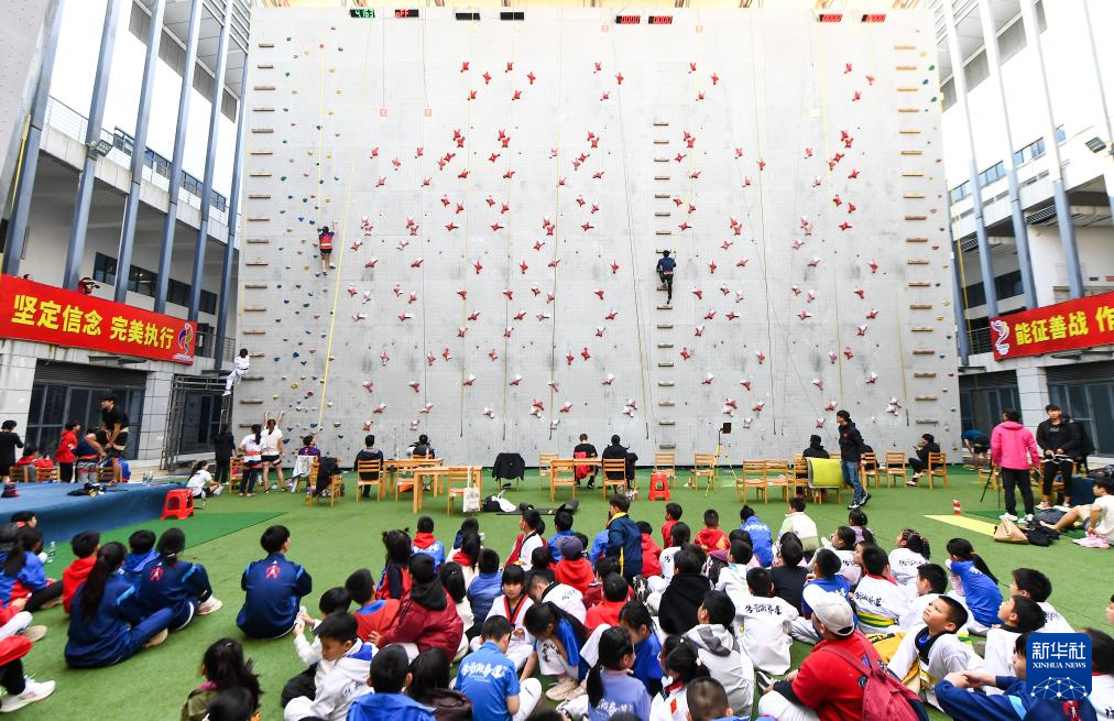 1月17日,小朋友观看国家攀岩队队员训练。