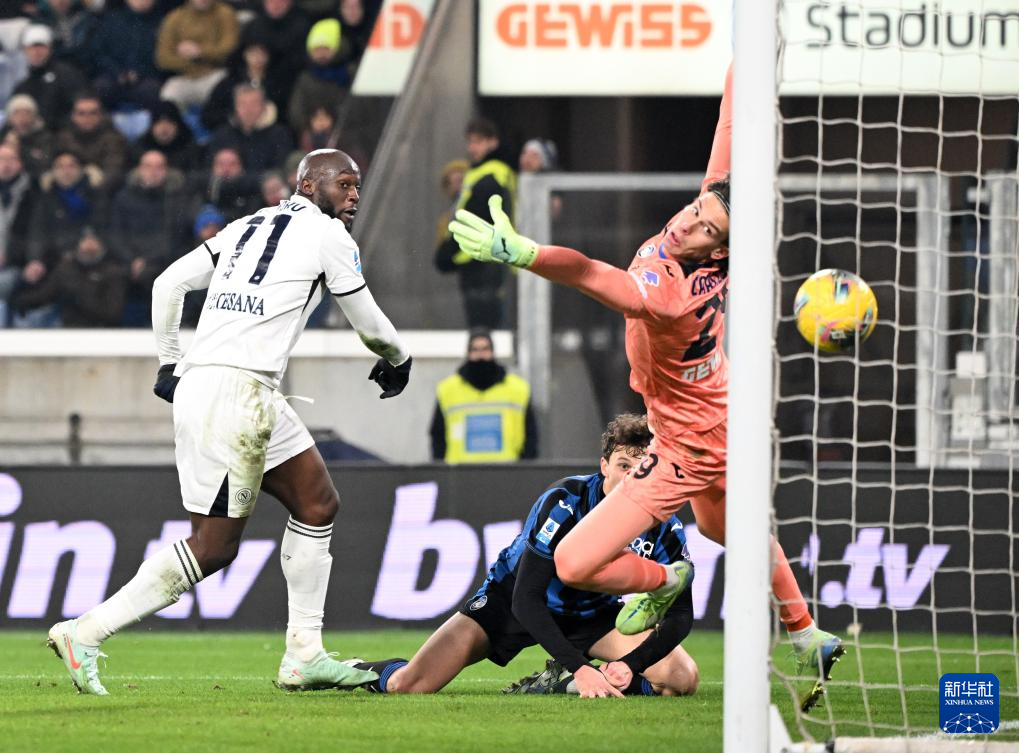 1月18日,亚特兰大队门将卡尔内塞基未能扑出那不勒斯队球员卢卡库的射门。