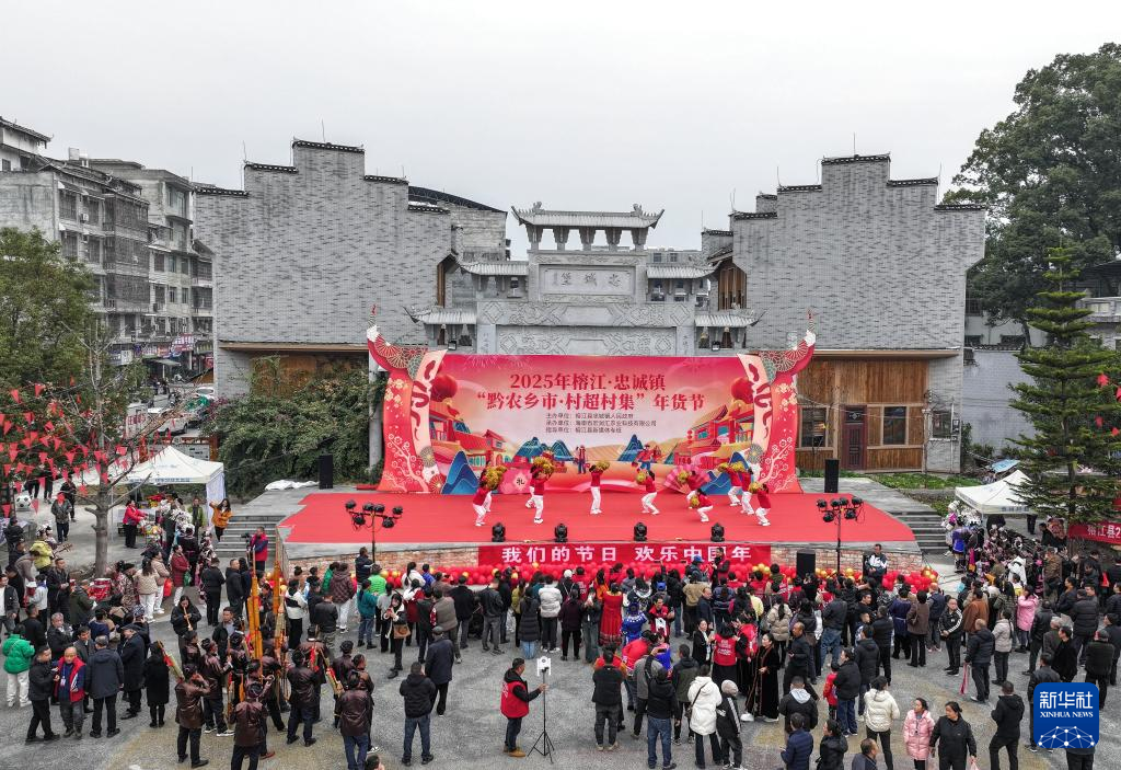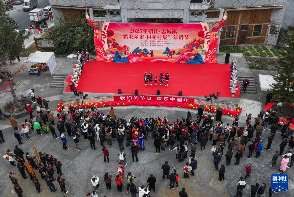 1月21日,人们在贵州省榕江县忠诚镇观看“黔农乡市·村超村集”年货节活动演出(无人机照片)。新华社记者 杨文斌 摄