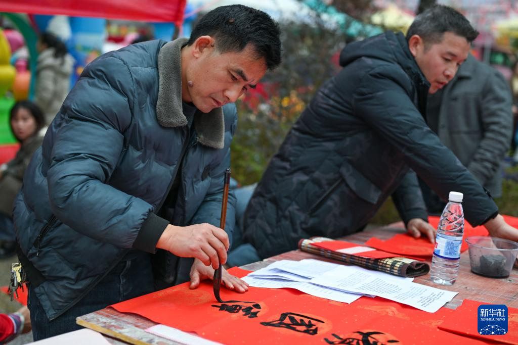 1月21日,书法爱好者在贵州省榕江县忠诚镇“黔农乡市·村超村集”年货节活动中为游客和村民写春联。新华社记者 杨文斌 摄