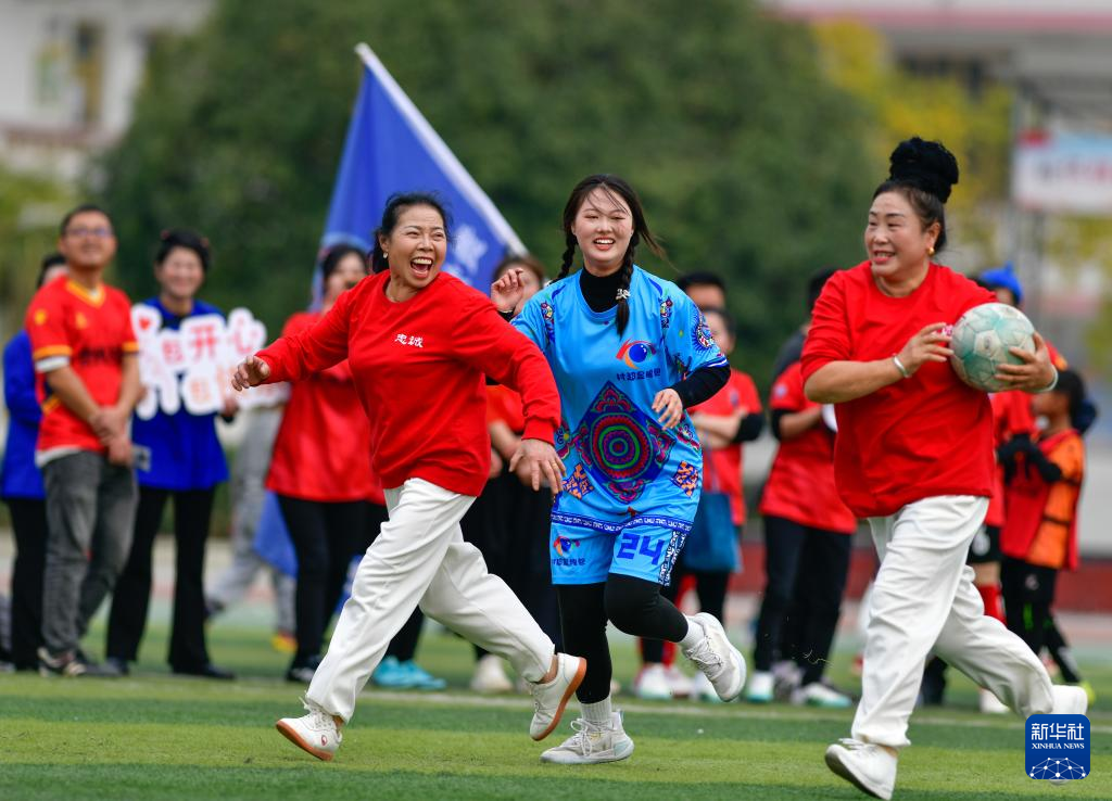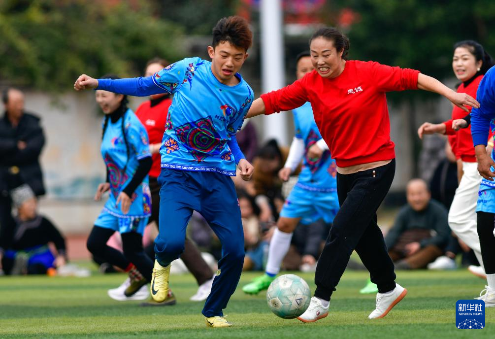 1月21日,在贵州省榕江县忠诚中学足球场,“显眼包”足球队与忠诚嬢嬢足球队(红衣)进行趣味足球赛。新华社记者 杨文斌 摄