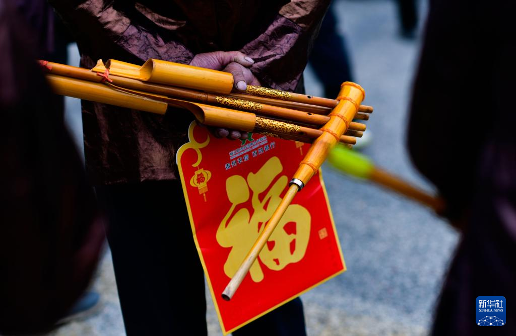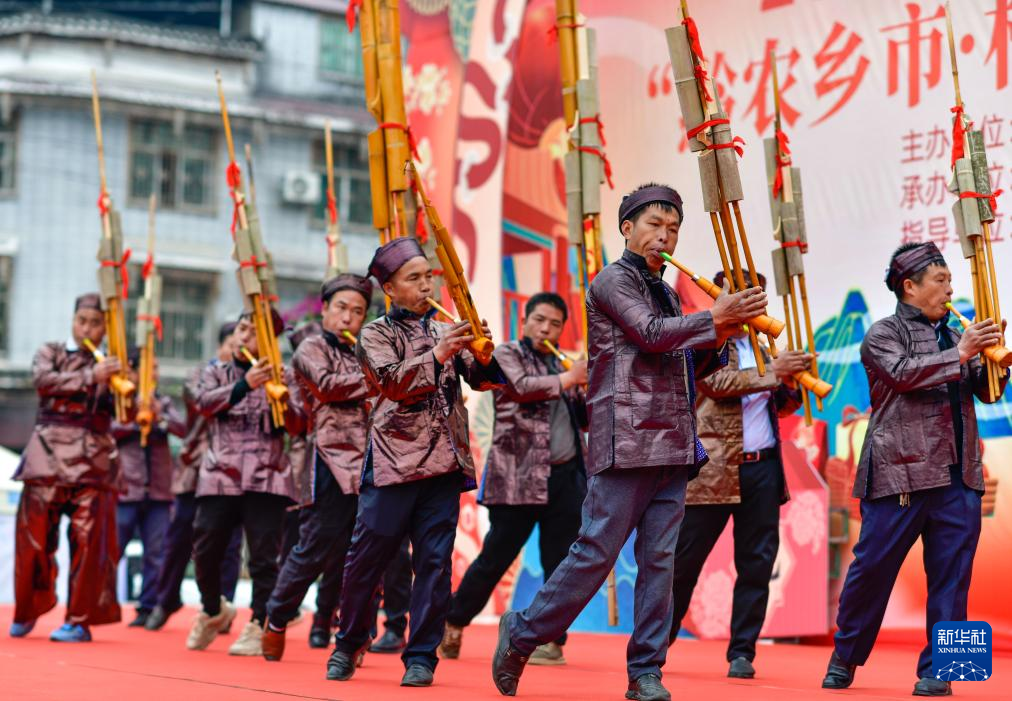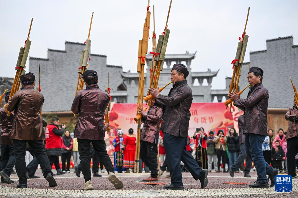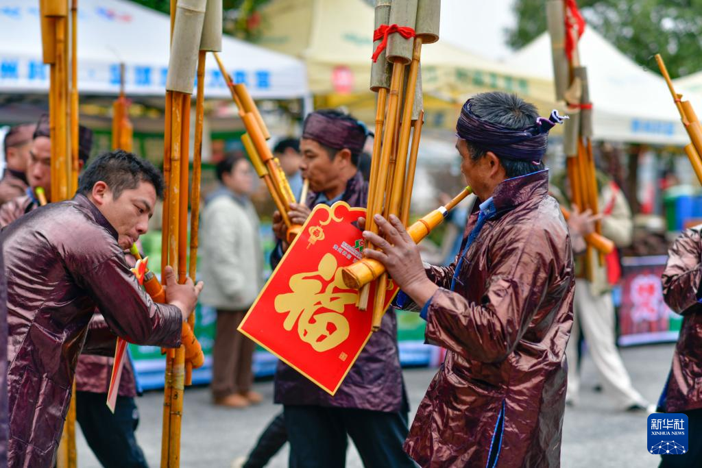 1月21日,村民在贵州省榕江县忠诚镇“黔农乡市·村超村集”年货节活动中吹奏芦笙。新华社记者 杨文斌 摄
