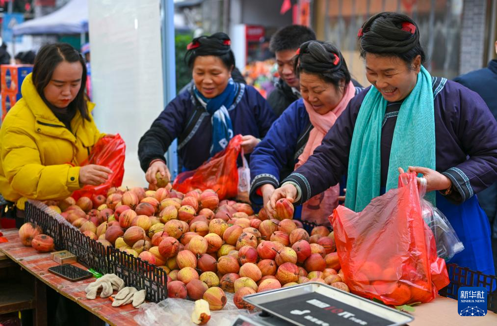 1月21日,村民在贵州省榕江县忠诚镇“村超村集”选购水果。新华社记者 杨文斌 摄