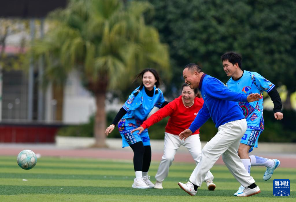 1月21日,在贵州省榕江县忠诚中学足球场,“显眼包”足球队(蓝衣)与忠诚嬢嬢足球队进行趣味足球赛。新华社记者 杨文斌 摄