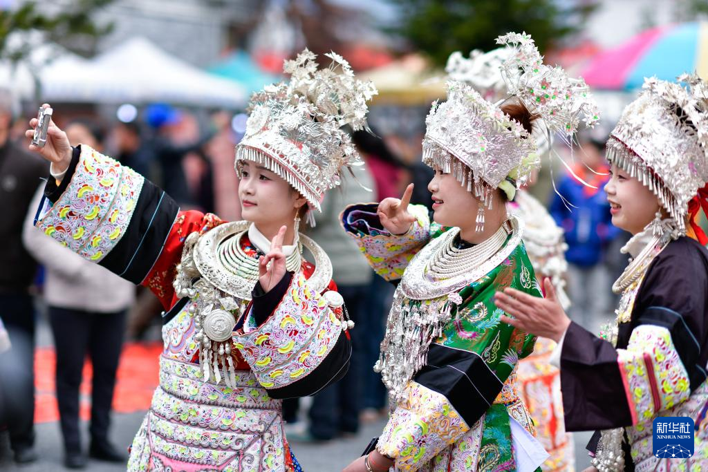 1月21日,三名苗族女孩在贵州省榕江县忠诚镇“黔农乡市·村超村集”年货节活动现场自拍。新华社记者 杨文斌 摄