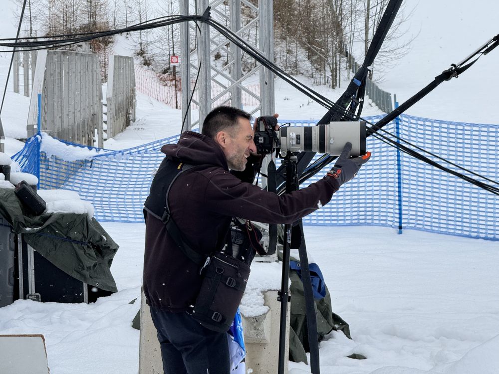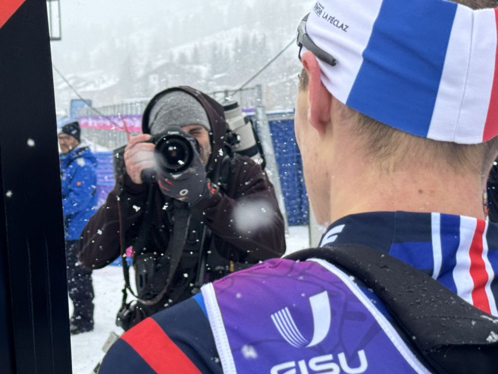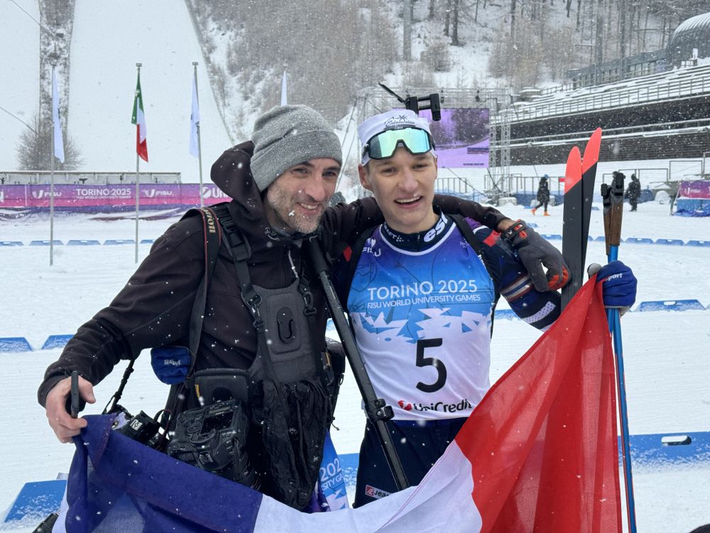 在世界大学生冬季运动会冬季两项大规模出发决赛男子比赛中,法国选手纳塔纳埃尔·皮昆凭借出色的表现夺得冠军。而当冠军在赛场上肩扛步枪,穿梭在雪道间射击与滑行时,场地外还有另一位皮昆——他的父亲弗兰克·皮昆同样肩扛“武器”,用镜头记录下儿子的每一个高光时刻。