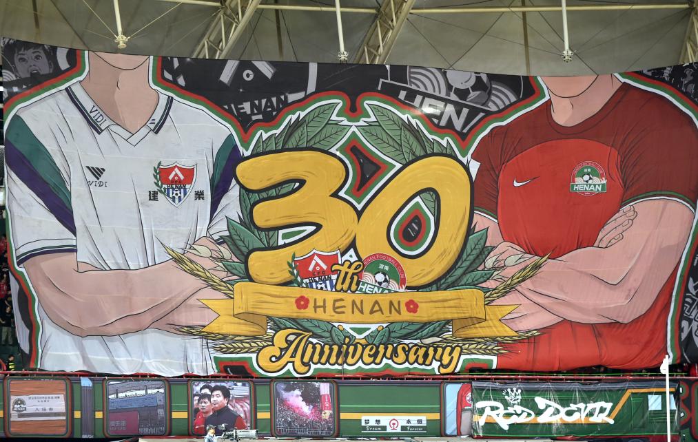 2024年9月21日,球迷在2024赛季中国足球协会超级联赛第26轮比赛赛前打出巨幅海报,庆祝河南足球俱乐部成立30周年。新华社记者 李嘉南 摄
