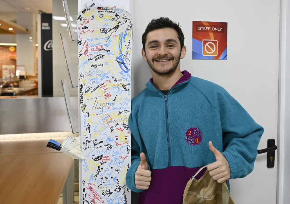 松弛下来的大学生们在咖啡厅三五成群聊天,有意无意间都会被一个写满签名的雪板吸引。有人驻足欣赏,有人拿起笔在雪板仅有的空白缝隙间写上自己的名字,有人拿起手机与雪板自拍……