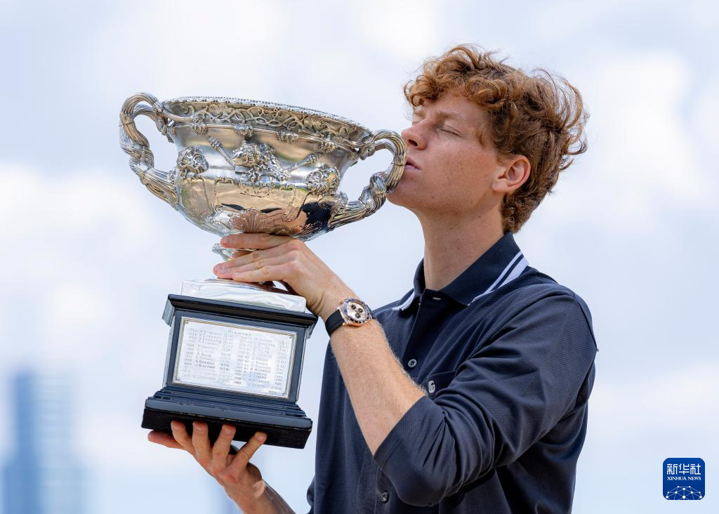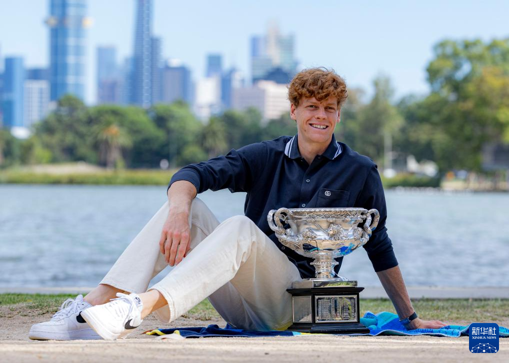 当日,2024年澳大利亚网球公开赛男子单打冠军、意大利选手辛纳在墨尔本阿尔伯特公园湖边展示冠军奖杯。