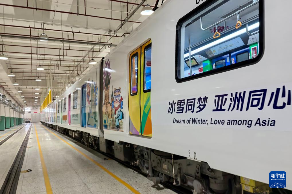 1月27日,哈尔滨地铁3号线“逐梦亚冬号”主题专列徐徐驶出地铁车辆段。新华社发