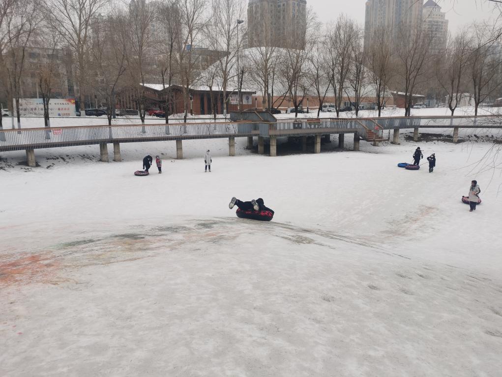 在哈尔滨湘江公园,28日一早,10岁的黄梓天就和爸爸一起来玩雪圈。这处公园里形成的自然雪坡,每年冬季都成为市民滑雪圈的好去处。“早上孩子要来,就带着过来玩一会,也是一种过年的方式。”黄梓天的父亲黄文说。