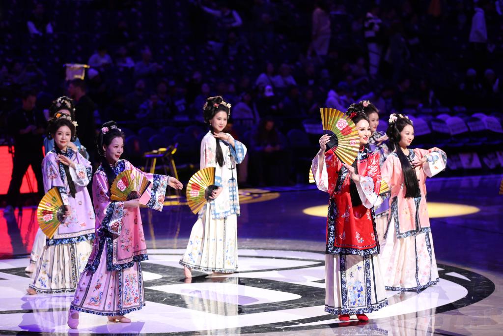 在比赛节间休息和暂停间隙,现场播放了球员拜年贺岁和体验中国文化的视频。