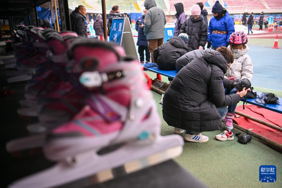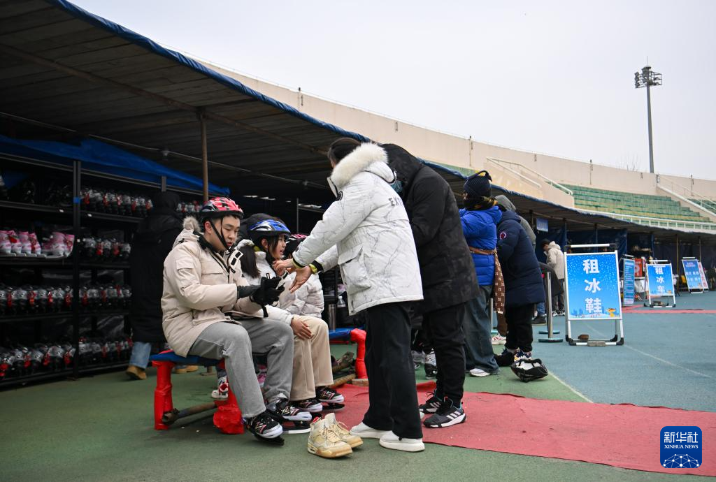 1月31日,市民在天津火车头体育场租用滑冰设备。