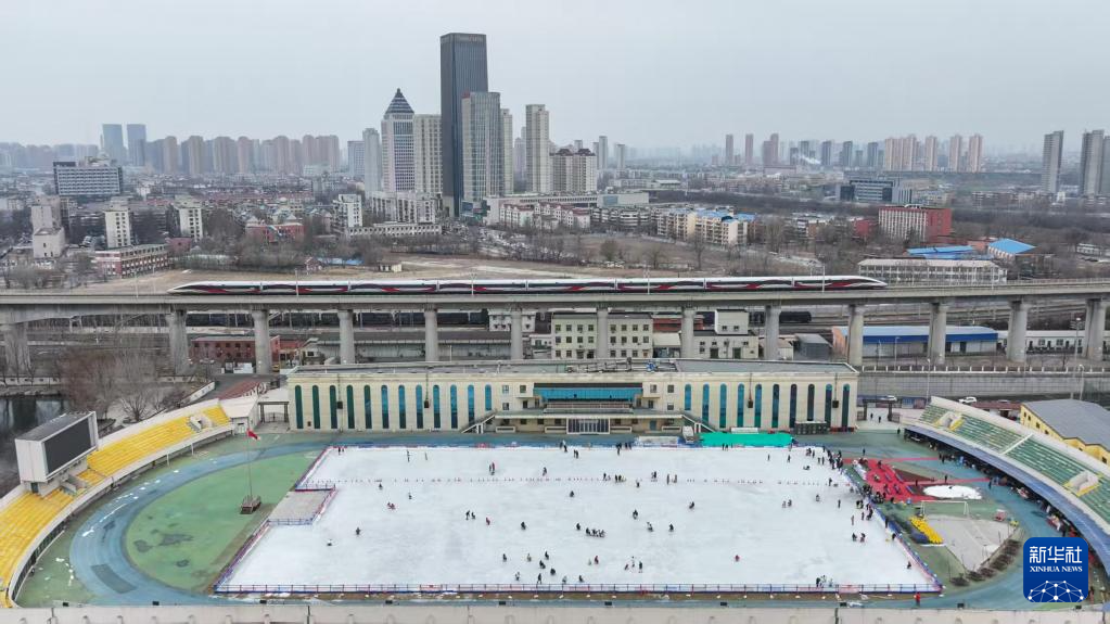 1月31日,市民在天津火车头体育场内的滑冰场滑冰。